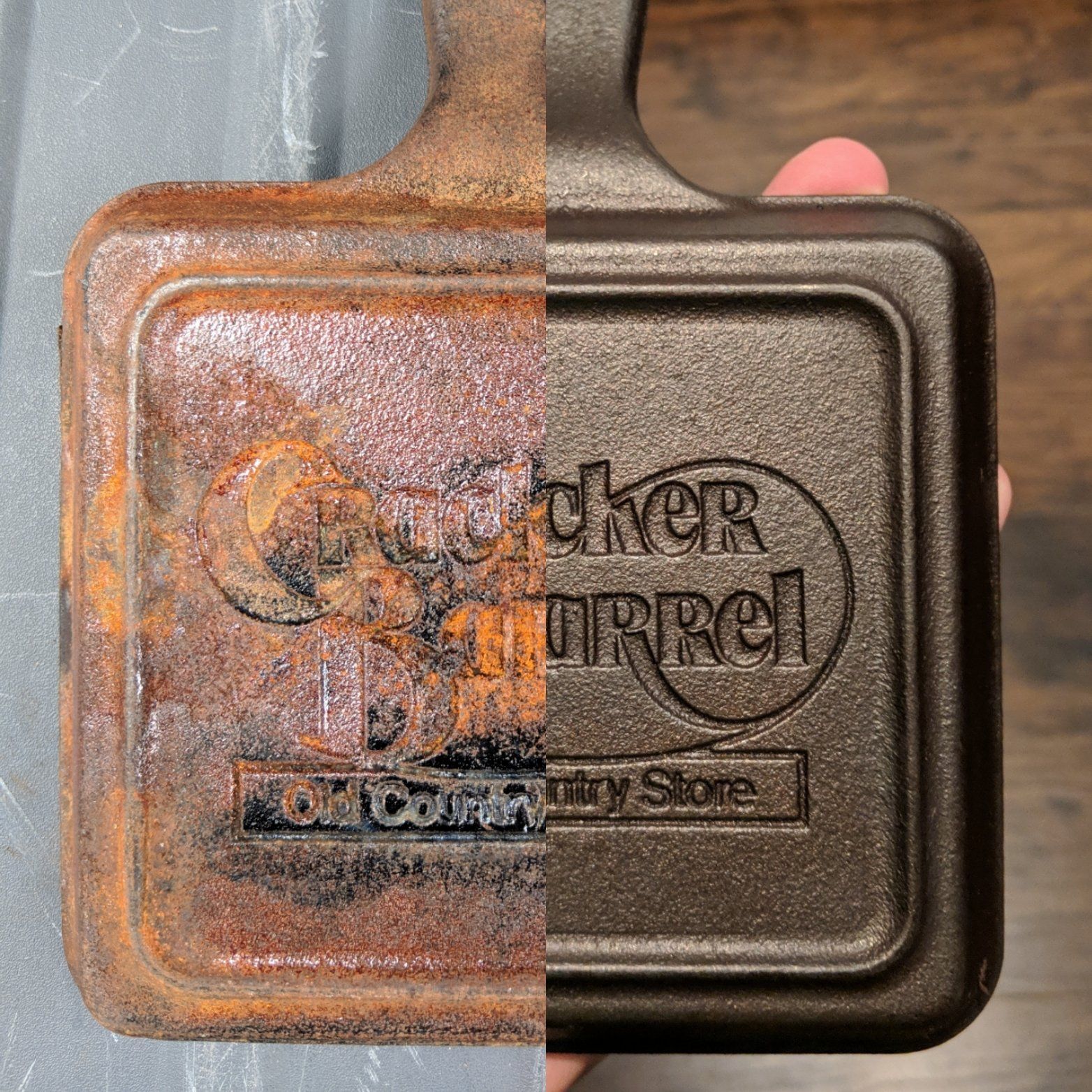 All cleaning is performed in the safest way possible to not damage the cast iron. We use a combination of 3 methods: a lye bath to remove all organic matter, Evaporust to remove most rust, and electrolysis to assist with stubborn seasoning and rust the other methods don't handle.
